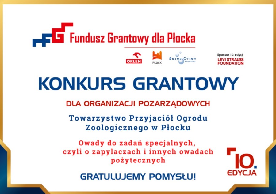 In the 10th edition of the grant competition organized by the "Grant Fund for Płock" Foundation, we received funding of 14,000 PLN for a project focused on pollinating insects. The funds were used to renovate the insect hotel located in the Zoo and to produce an educational nature film about the hotel’s residents and other pollinators appearing in the Zoo. We are extremely happy that we could document the insects inhabiting the hidden corners of our Zoo—these tiny creatures that often go unnoticed during a visit but play an incredibly important role in nature, forming the largest animal group on Earth.